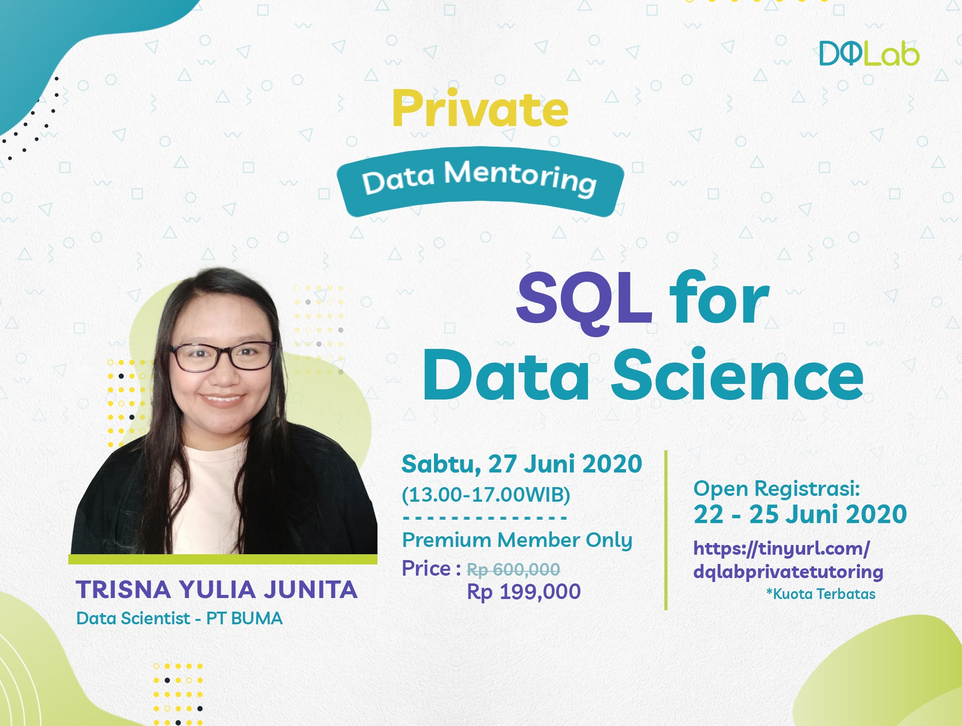 Ikuti sesi data mentoring "SQL for Data Science" untuk belajar langsung bersama Trisna, dan kupas tuntas module SQL yang tersedia di DQLab. Sesi data mentoring ini hanya dapat diakses oleh PREMIUM Member dengan kuota 50 orang.
