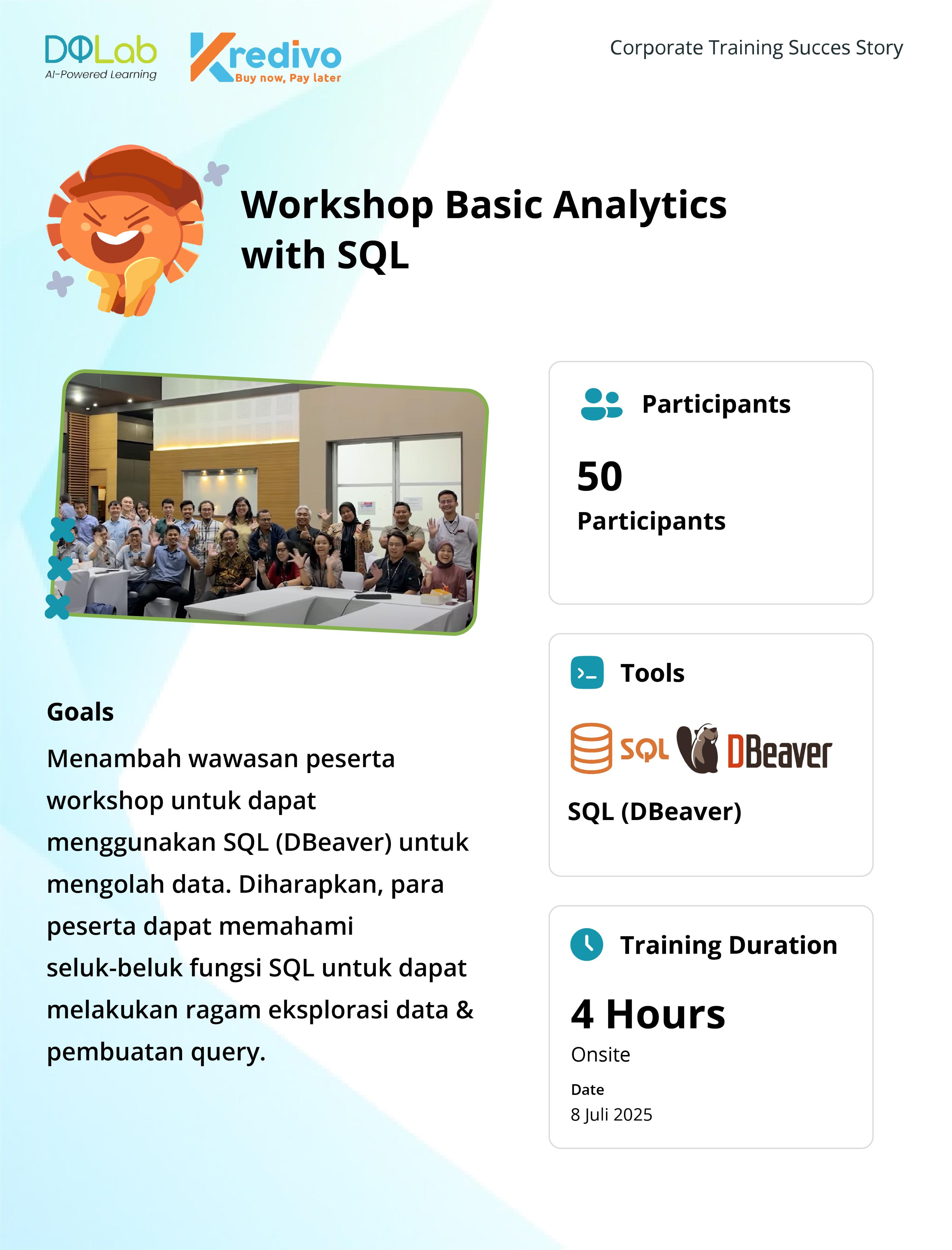 Training ini bertujuan untuk membekali peserta dengan kemampuan dasar dalam menggunakan SQL untuk melakukan analisis data. Peserta diharapkan dapat memahami konsep dasar database, menulis query untuk mengekstrak dan mengolah data, serta memanfaatkan keterampilan ini untuk mendukung analisis bisnis yang lebih informatif. Selain itu, peserta akan mendapatkan pemahaman yang lebih baik mengenai bagaimana SQL berfungsi dalam konteks data-driven decision-making, sehingga mereka dapat lebih efektif dalam berkontribusi pada proyek data analytics di tempat kerja.