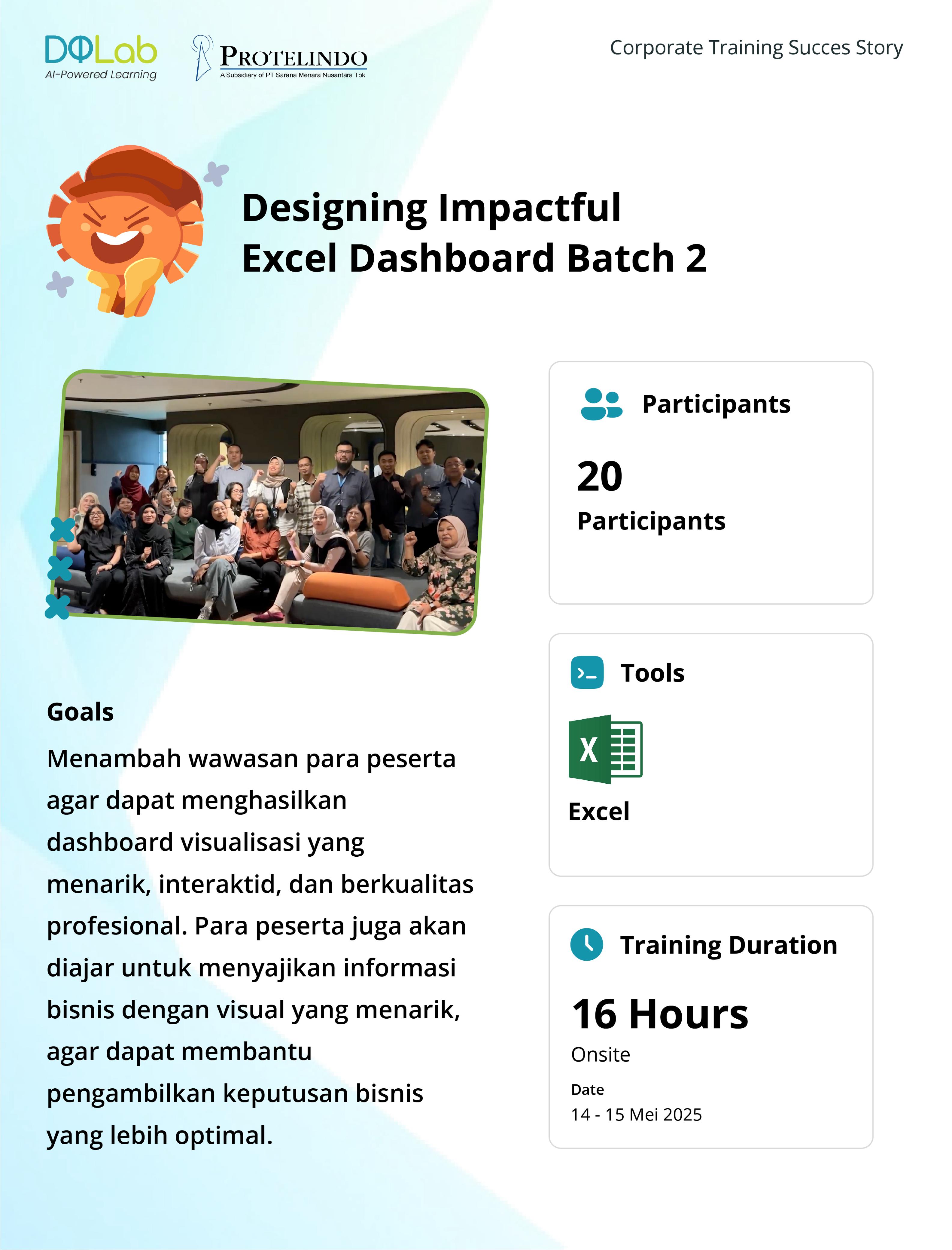 DQLab bekerja sama dengan Protelindo (SMN Group) mempersembahkan Training Designing Impactful Excel Dashboard Batch 2 yang dirancang untuk memberikan pemahaman mendalam dan keterampilan praktis dalam merancang dashboard menggunakan Excel yang efektif dan impactful. Pelatihan ini mencakup berbagai teknik dalam pembuatan dashboard interaktif, mulai dari pengolahan data dengan PivotTables, penggunaan grafik yang tepat, hingga penerapan prinsip desain yang dapat meningkatkan pemahaman dan pengambilan keputusan berbasis data. Peserta akan belajar untuk merancang dashboard yang tidak hanya informatif tetapi juga visual dan mudah dipahami oleh berbagai pihak di perusahaan.