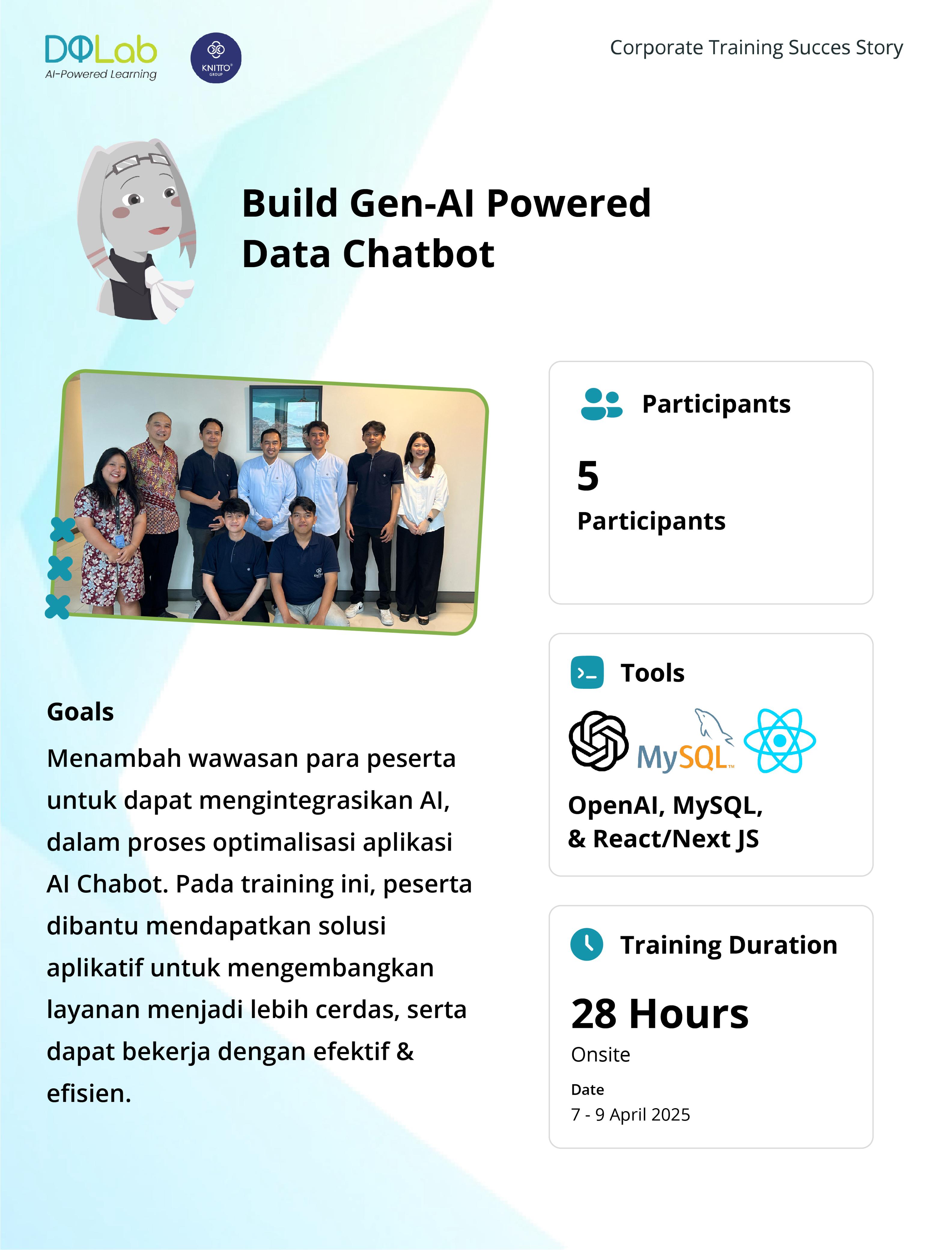 DQLab berkolaborasi dengan PT. Knitto Tekstile Indonesia dalam corporate training dengan tema Build Gen-AI Powered Data Chatbot, sebuah pelatihan eksklusif yang dirancang untuk membekali peserta dengan keterampilan membangun chatbot berbasis kecerdasan buatan generatif (Gen-AI). Melalui sesi interaktif, peserta akan belajar cara mengembangkan chatbot yang mampu memahami, menganalisis, dan menyajikan data secara otomatis untuk mendukung pengambilan keputusan bisnis.