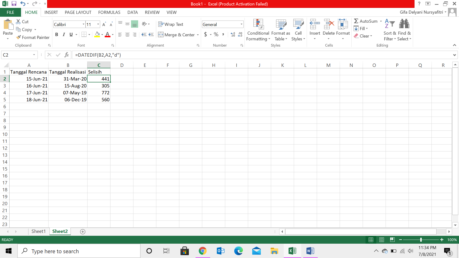Misalkan kita ingin mencari berapa banyak selisih antara tanggal realisasi dengan tanggal rencana, maka kita bisa menggunakan fungsi DATEDIF. Agar selisih bisa berbentuk hari, maka kita harus mendefinisikan nya dengan menambahkan kode date partnya berupa "d". Kemudian "m" untuk bulan, dan "y" untuk tahun.
