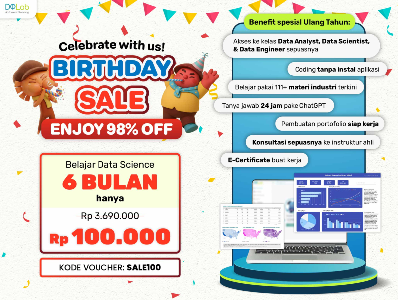 Untuk membangun generasi data yang siap berkarir di Industri. DQLab memberikan promo khusus untuk Sahabat DQ untuk bisa belajar Data Science dari dasar secara efektif. Nikmati DQLAB BIRTHDAY SALE! 6 BULAN 100K Belajar Data Science Bersertifikat, Belajar Jadi Makin Hemat dan raih karier Impian!Yuk, jago Data Science dengan metode belajar HERO! Simak informasi dibawah untuk lebih mengenal HERO!