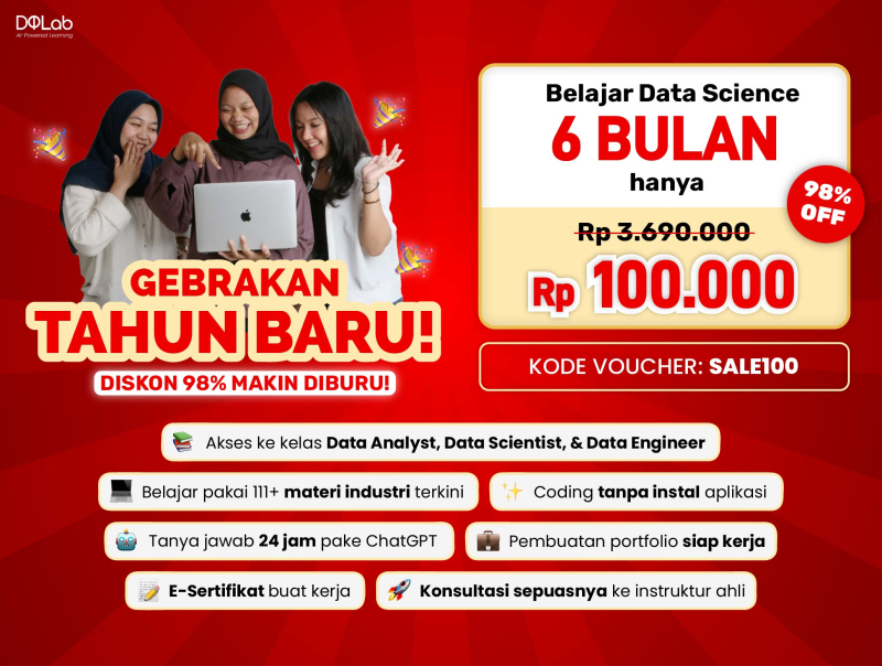 Untuk membangun generasi data yang siap berkarir di Industri. DQLab memberikan promo khusus untuk Sahabat DQ untuk bisa belajar Data Science dari dasar secara efektif. Nikmati PROMO GEBRAKAN TAHUN BARU! 6 BULAN 100K Belajar Data Science Bersertifikat, Belajar Jadi Makin Hemat dan raih karier Impian!Yuk, jago Data Science dengan metode belajar HERO! Simak informasi dibawah untuk lebih mengenal HERO!